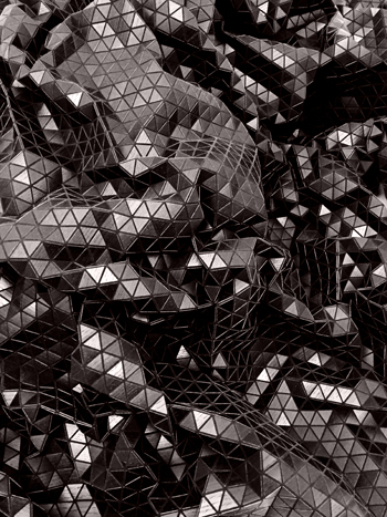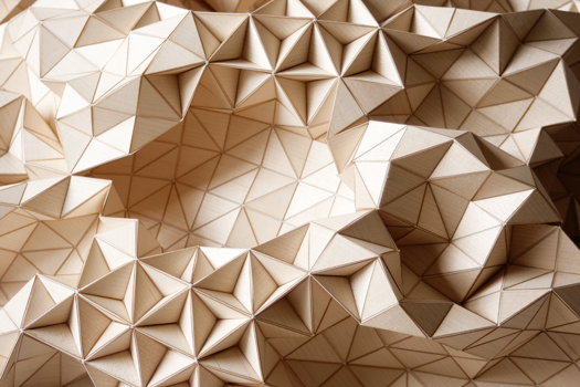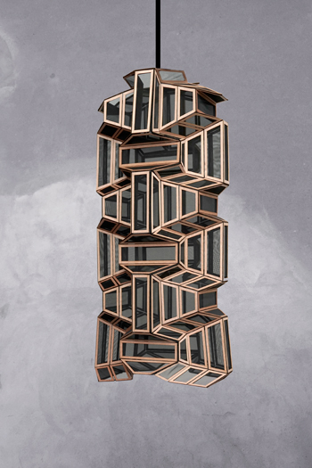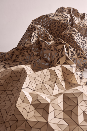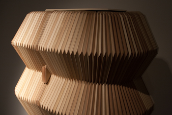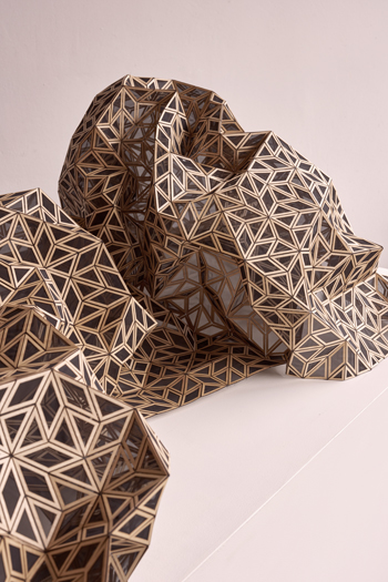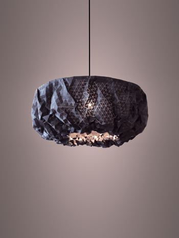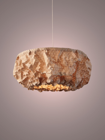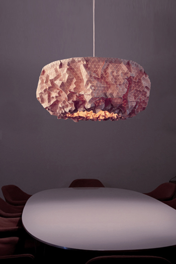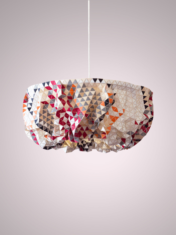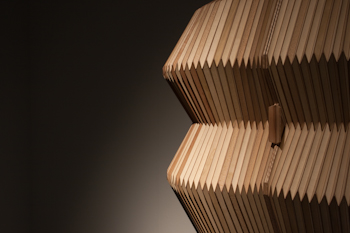 MISS MAPLE pendant lamp, 85 x 85 x 35 cm The pendant lamp "Miss Maple" is showing the use of a familiar material in an unconventional way. We usually experience wood as a plain surface, but here it is broken down into a grid of triangles. This makes a flexible lampshade which can be transformed manually in three-dimensional ways. |