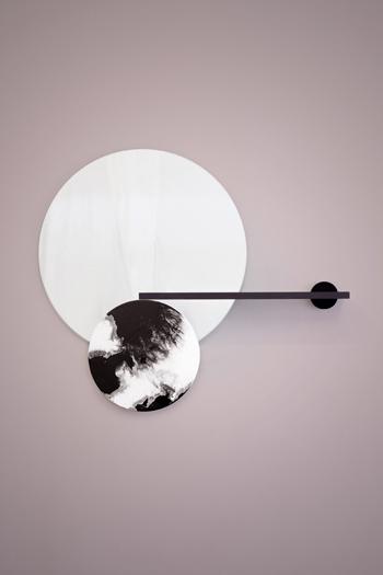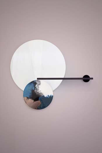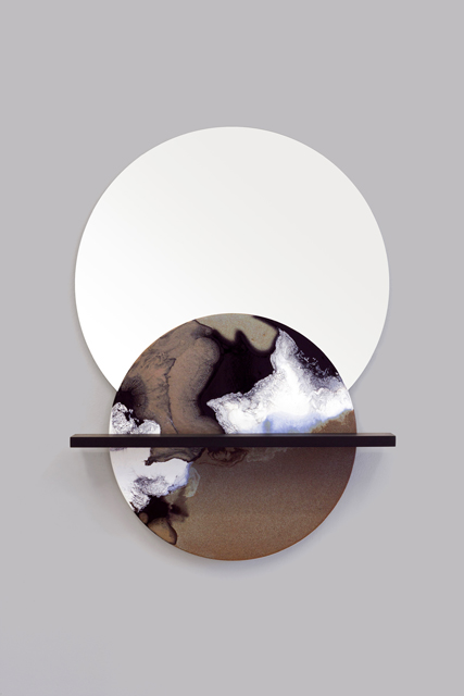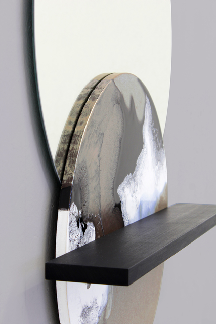 "OVERLAP-MIRROR" WALL-MIRROR-SHELVE MATERIALS: CORDERIET, CERAMIC GLAZES, WOOD, MIRROR SIZE(HxW):83cmx60cm SIZEshelve:60cmx10cmx2cm SIZE mirror: 60 cm (Diameter) SIZE ceramic piece : 47 cm (Diameter) PRICE: 2050 EUR |