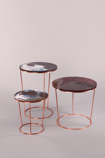 Glazing clay is one of the oldest techniques to decorate products of everyday life. The "ceramic-tables" are available in three different sizes, each tabletop is unique. |